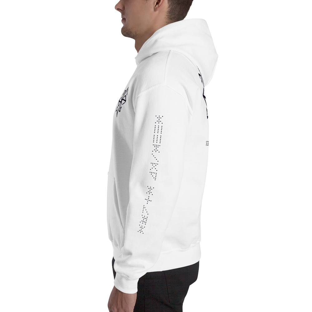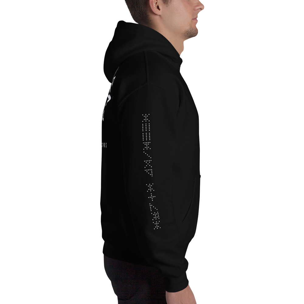 Hooded sweatshirt with Seeking Stars logo across whole back, small on left front breast area, and text logos on both sleeves. Made with 50/50 polyester/cotton. Front pouch pocket.